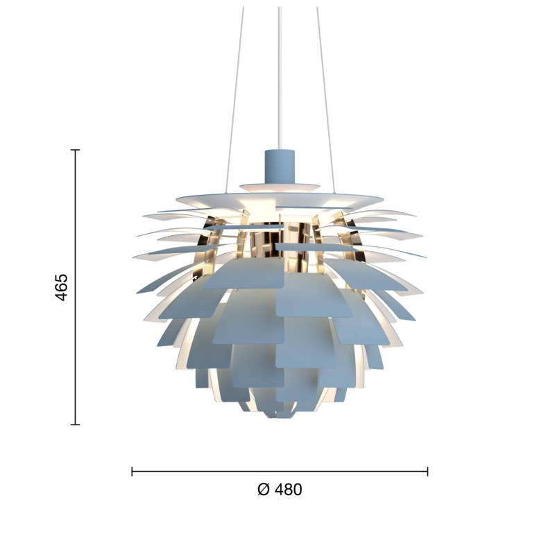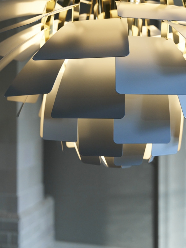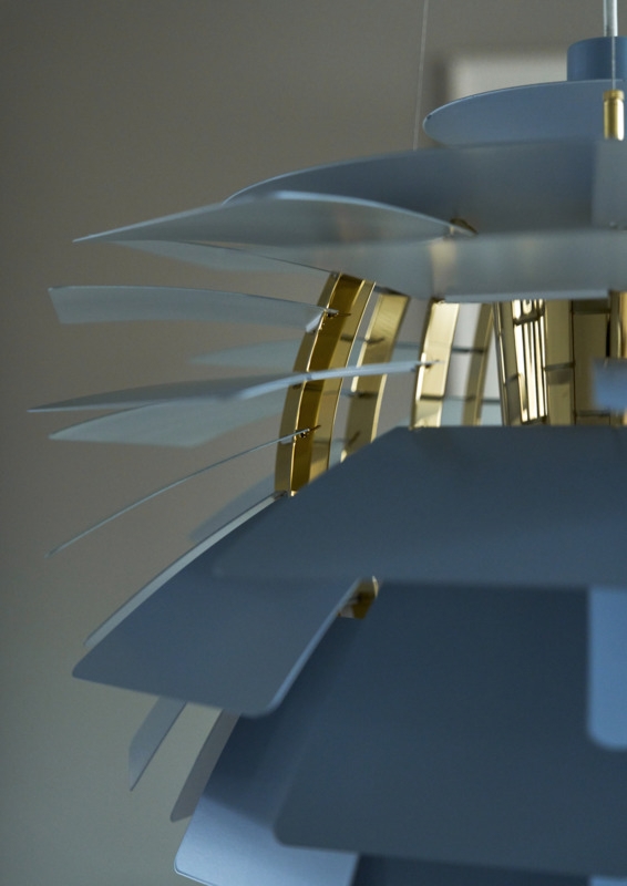 Den unikke pendel reflekterer lyset både indad og udad, hvilket er med til at udsende det fantastiske lys. Bladene på PH Artichoke i dusty blue/messing er fremstillet af laserskåret stål og har en bleg og støvet grålig-blå farve med kølige undertoner, der giver ro til omgivelserne. Overskærmen er i optrukket stål, stellet er i stål med finish i metalliseret messing og ophænget er i optrukket aluminium.