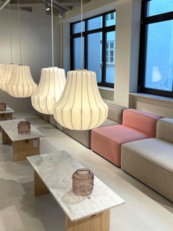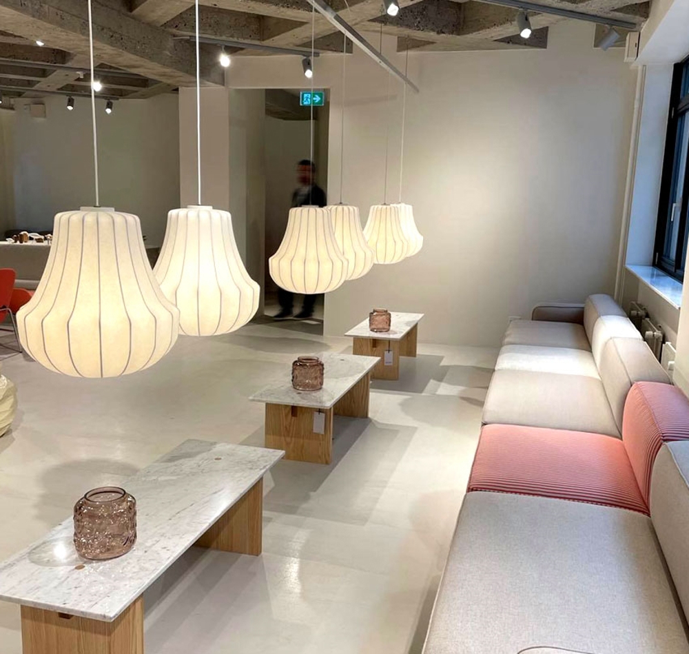 Lampen er fremstillet ved sprøjtning af tynde tråde af brandhæmmende resin på en stålramme. Mange lag af tråde fuldender lampeskærmen, præcis som en silkeorm laver sin kokon.