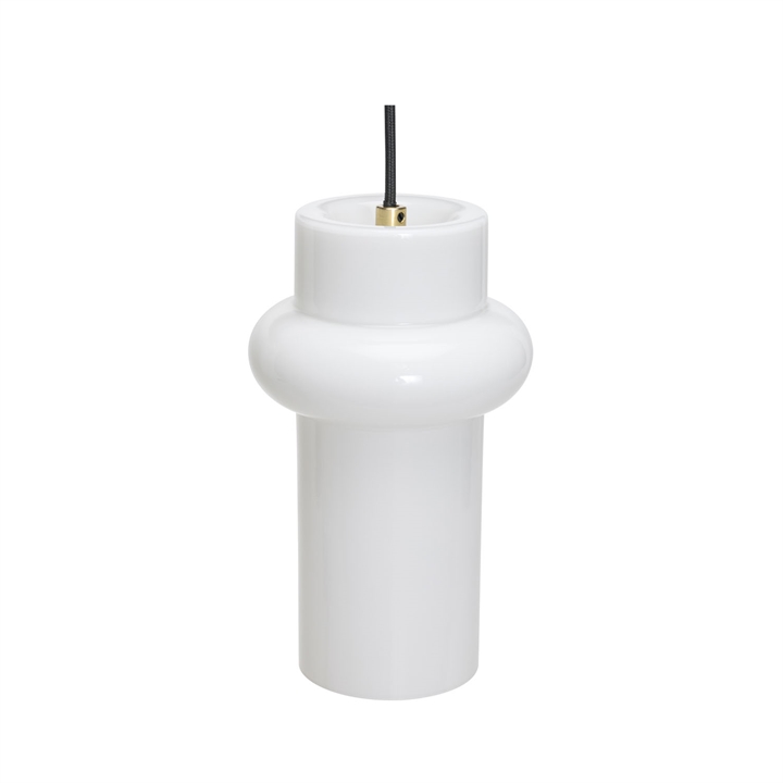 Pilule forener et klart og nutidigt udtryk med referencer til 80’ernes formsprog. Denne variants skinnende hvide skærm i mundblæst opalglas spreder et behageligt og jævnt lys, mens fine detaljer i messing og den sorte stofledning tilfører karakter og kontrast til lampen.