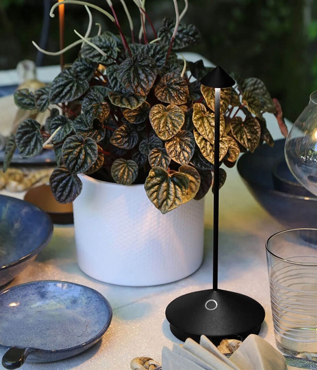 Batterilampen Pina har et stilfuldt design med et diskret lampehoved på en slank lampestilk med en solid base. Den transportable bordlampe er nem at tage med sig og kan dæmpes i styrke, så lyset passer til den ønskede stemning via en touch-funktion på basen. Her vælges også farvetemperatur på enten 2200K, 2700K eller 3000K. Indstillingen for farvetemperatur kan huskes af en hukommelsesfunktion.