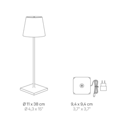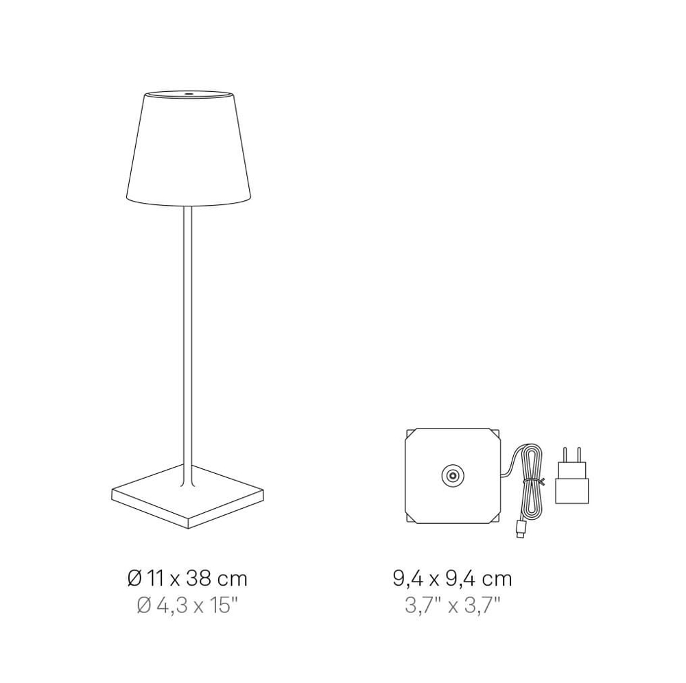 Den transportable bordlampe Poldina har et stilfuldt design med et klassisk lampehoved på en slank lampestilk med en diskret base. Lampen findes også i de mindre udgaver mini og micro.