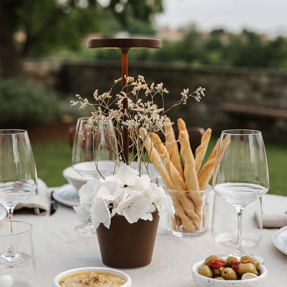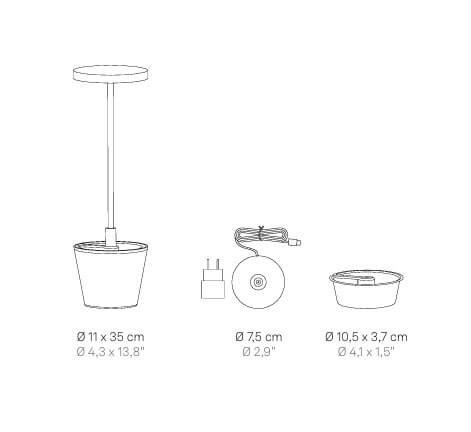 Bordlampen er nem at tage med sig og kan med sin IP54-klassificering benyttes både indendørs og udendørs. Lampen kan dæmpes i styrke med en touch-funktion på undersiden af skærmen, så lyset passer til den ønskede stemning. Farvetemperatur på enten 2200K, 2700K eller 3000K vælges også med touch-funktionen og kan huskes af en hukommelsesfunktion.