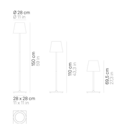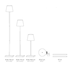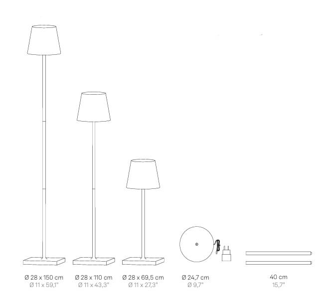 Den ledningsfri Poldina XXL gulvlampe kan med sin IP54-klassificering benyttes både indendørs og udendørs. Batterilampen er genopladelig og har et stilfuldt og enkelt udtryk med et klassisk lampehoved på en slank lampestilk med en diskret base. Gulvlampen er nem at flytte og kan tilpasses i højden til 150 cm, 110 cm eller 69,5 cm ved at fjerne eller tilføje stykker af lampestilken.