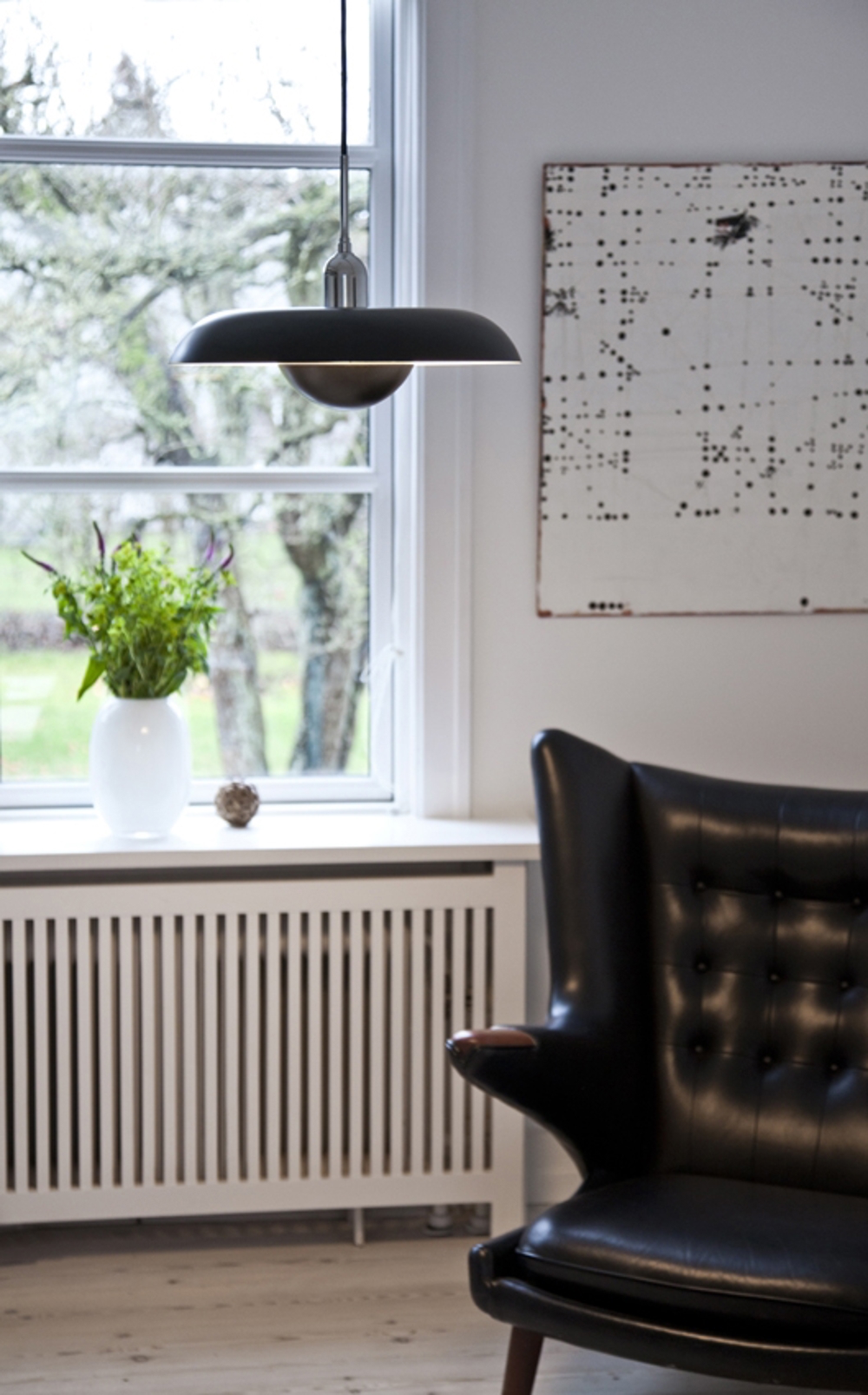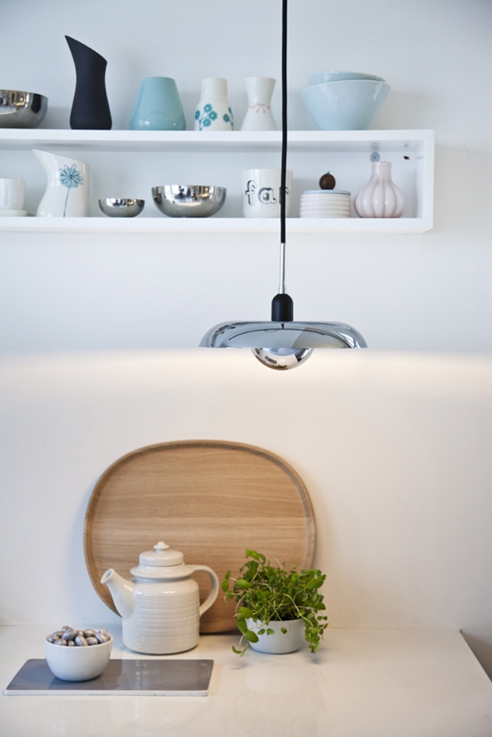 RA findes i to størrelser som pendel og bordlampe i hvid, sort og krom.