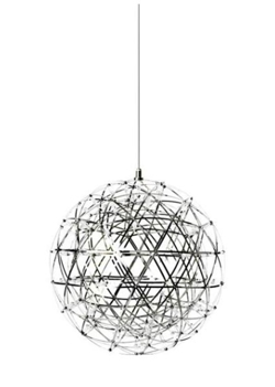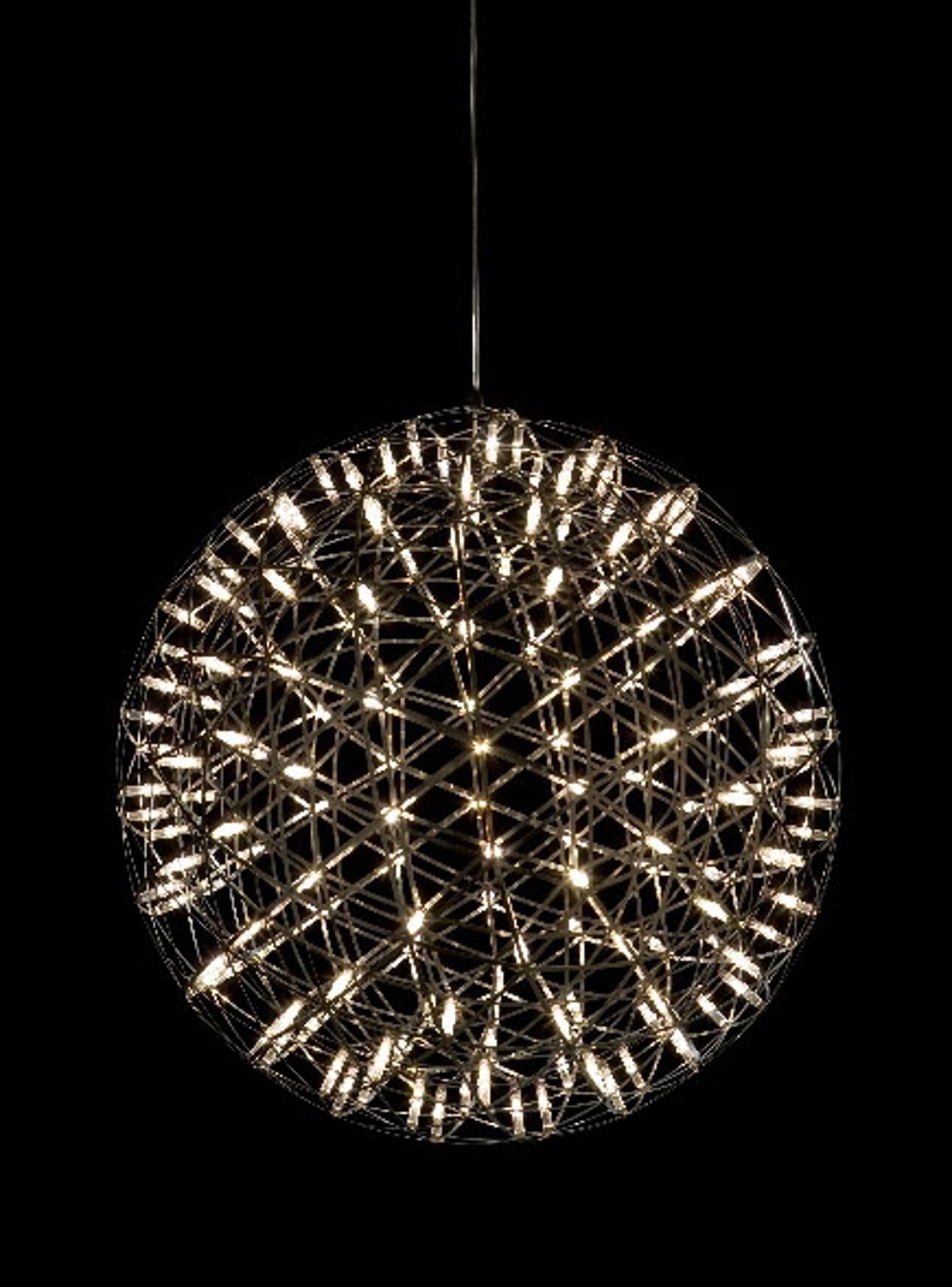 Raimond Puts har genskabt en stjerneklar nat med Raimond pendlen, så man kan få samme enestående effekt af at kigge på denne smukke lampe. Moooi pendlen består af en flot kugle, som er skabt af spinkle metalbånd, samt 92 glimtrende LED lyskilder som er placeret ved metalbåndenes samlinger.