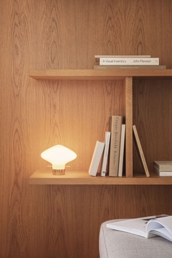 Bordlampen Repose i blankt mundblæst opalglas har en lethed i designet, hvor en karakteristisk pind i messing holder skærmen. Messingpinden er inspireret af traditionelle japanske hårnåle, der trods en simple udformning har stor funktionalitet.