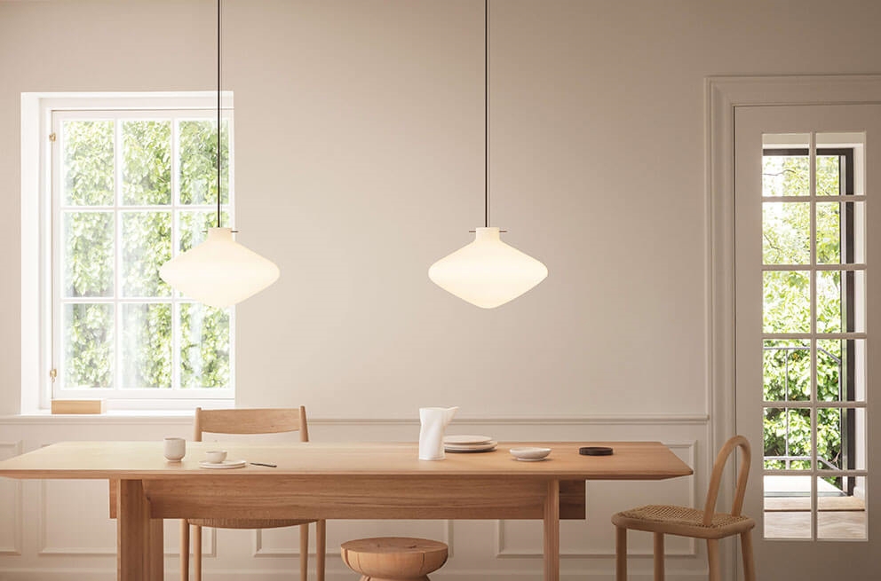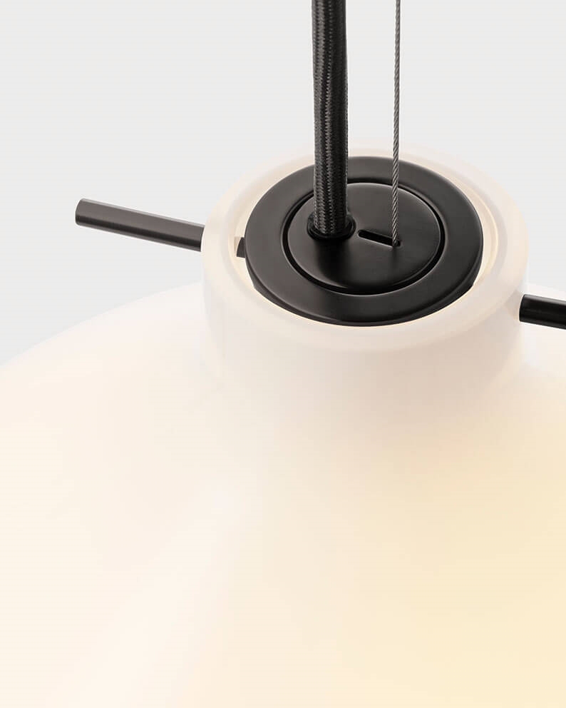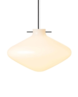 Pendlen Repose i blankt mundblæst opalglas har en lethed i designet, hvor en karakteristisk sort metalpind holder skærmen svævende i luften. Metalpinden er inspireret af traditionelle japanske hårnåle, der trods en simple udformning har stor funktionalitet.
