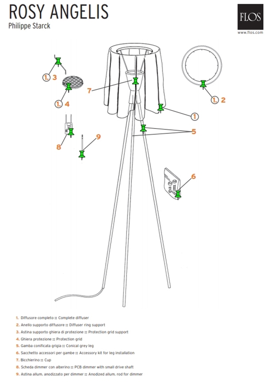 Rosy Angelis gulvlampe designet af Philippe Starck. Dette er en reservedel bestående af en inderskærm/reflektor til Rosy Angelis gulvlampen fra Flos. Det er nr. 7 på tegningen, der viser inderskærmen.