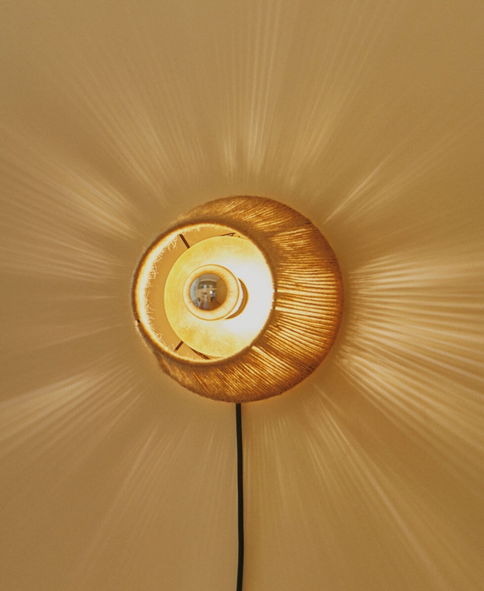 Væglampen Ro er fremstillet af stærkt og holdbart jutegarn bundet om en jernramme. Inspirationen er hentet i traditionel dansk håndværksteknik fra 1920'erne og 1930'erne, hvor simple lampeskærme blev lavet ved at binde garn om en træramme. Væglamperne i lampeserien findes i flere varianter og er et godt valg til entreen, soveværelset eller stuen.