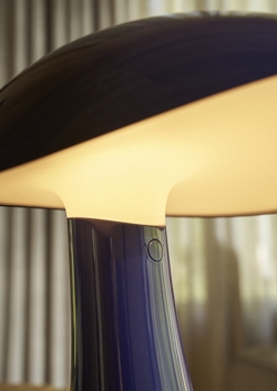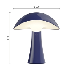 Batterilampen Rumee i blå har et moderne og funktionelt design med en blød skulpturel form inspireret af de bølgede kurver i en rummelig og bred hat. Navnet spiller på lyden af roomie - det uformelle udtryk for en bofælle – og fremkalder en følelse af hjemlighed, varme og tryghed.