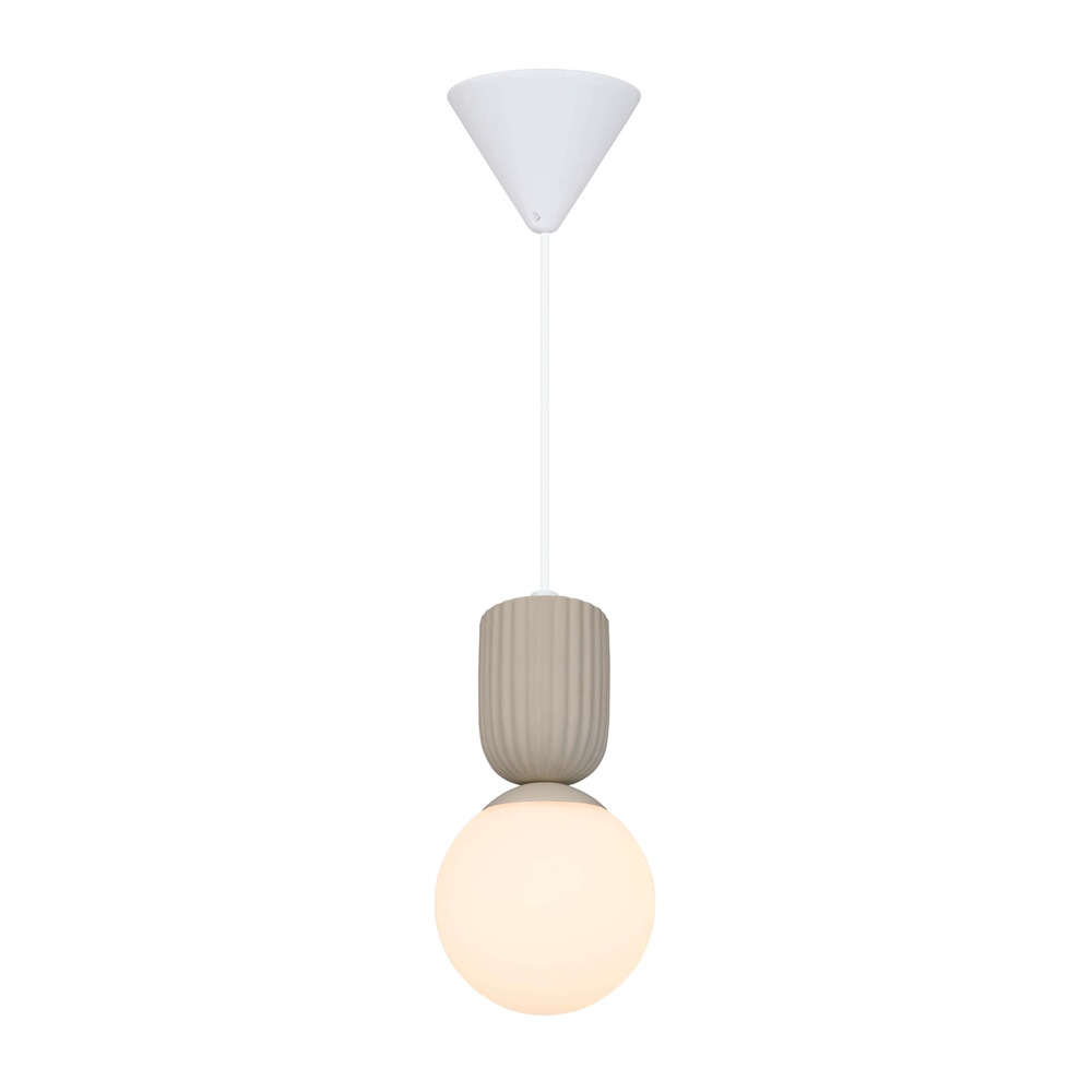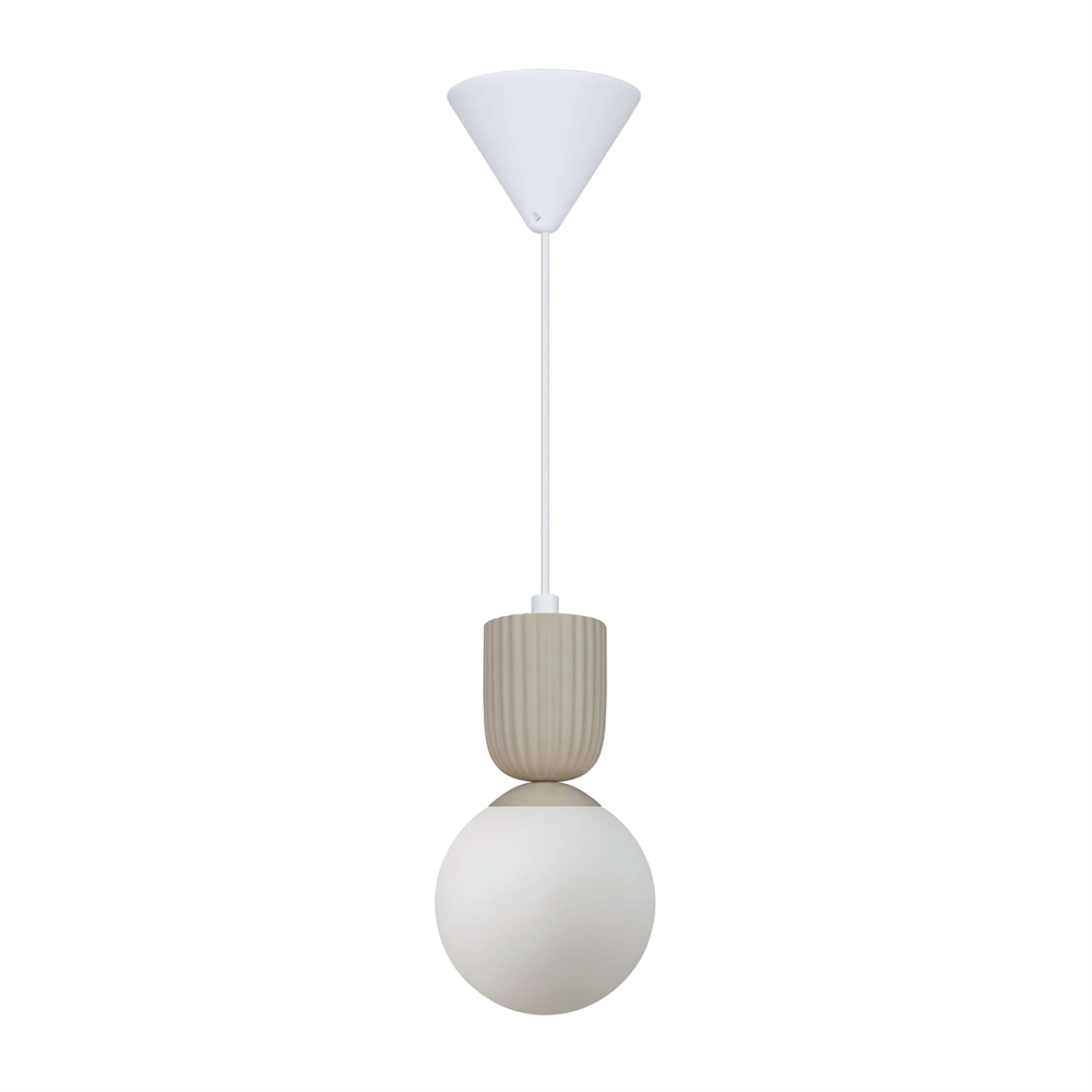 Pendlen Sadie har et flot udtryk med et mix af opalglas og riflet keramik. Lampen leverer et behageligt og blændfrit lys fra den mundblæste kuppel i opalglas, der får karakter og sit levende udseende fra den manuelle fremstilling og kan variere i udtryk og tykkelse.