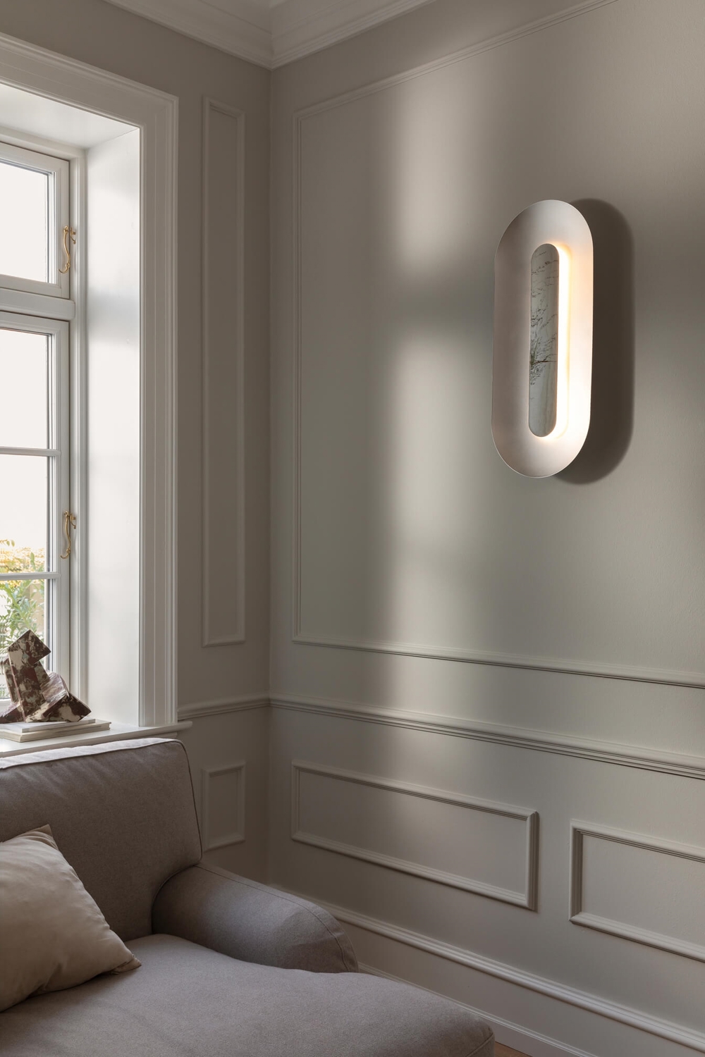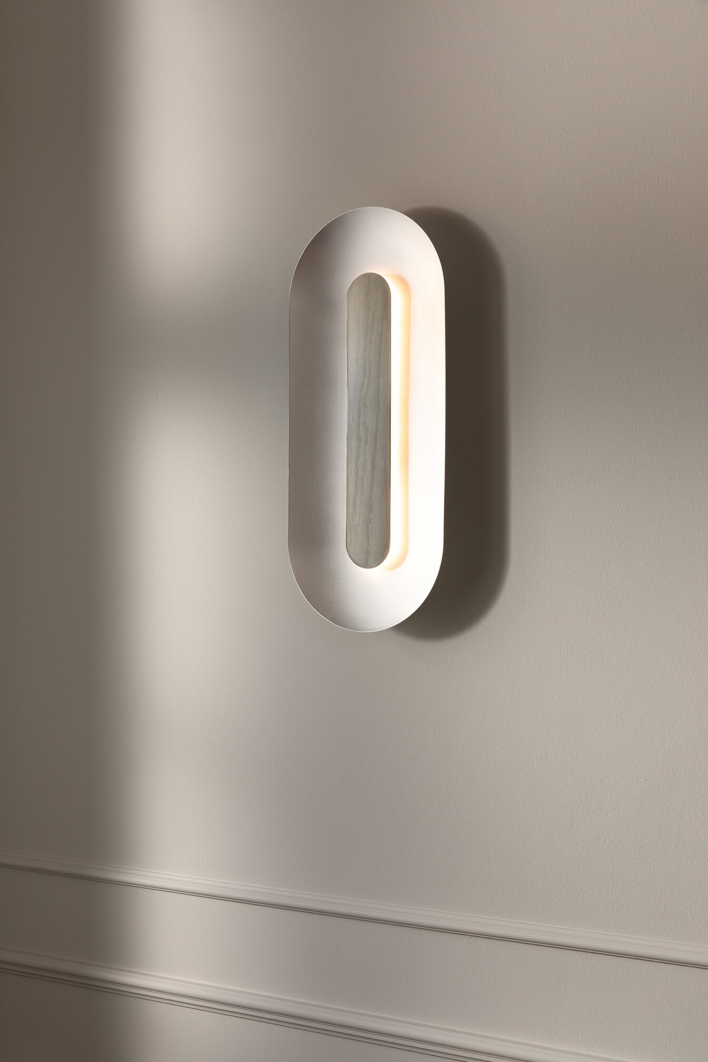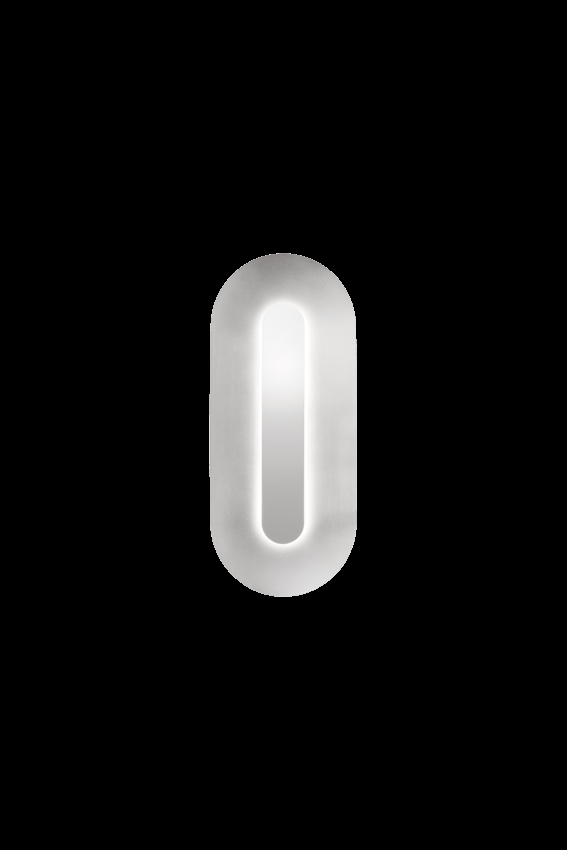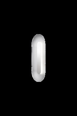 Sasi Large væglampe skaber en smuk dekorativ med sin bløde formgivning, en harmonisk farvepalette og nøje udvalgte materialer. Sasi består af en oval aluminiumsskærm i børstet sølv, som udgør basen - og en mindre form i blankpoleret messing er placeret i midten af lampen. Den blanke skærm dækker det integrerede LED-modul, der spreder og reflekterer et dekorativt lys. Sasi væglampen er smuk både tændt og slukket.
