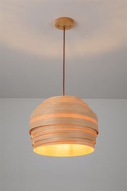 Designet er inspireret af planeternes ringe og opbygget af tynde, lagdelte trælameller. Denne konstruktion giver et karakteristisk spil mellem lys og skygge, hvor lyset filtreres blødt ud i rummet og skaber en rolig og atmosfærisk belysning. Samtidig er bunden åben, hvilket sikrer et mere direkte og funktionelt lys nedad.