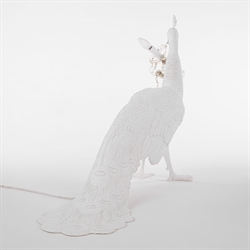 Denne påfugle-lampe er fremstillet i resin/glas/akryl og bliver et flot statement piece i din indretning. Stil den på gulvet som blikfang. Lampen er beregnet til indendørs brug.