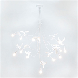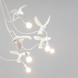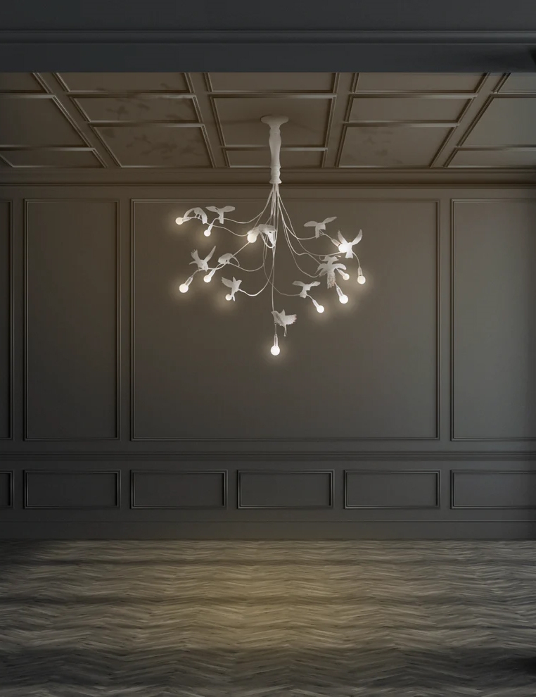 Vi fornemmer fuglenes livlighed, når de næsten vækker lyset til live. Designeren har ønsket at indfange det særlige øjeblik, hvor man betragter en lille fugl, hemmeligt optaget af sit eget univers. Lampens karakteristiske ledning understreger bevægelsen og genskaber den fine, næsten magiske stemning, som kendetegner disse små væsener. Et poetisk og stemningsfuldt design, der tilfører rummet både varme, lethed og personlighed.