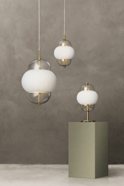 Shahin er en utrolig elegant bordlampe med flotte detaljer i messing, der består af to glasskærme og et smukt hvidt opalglas i midten.