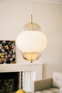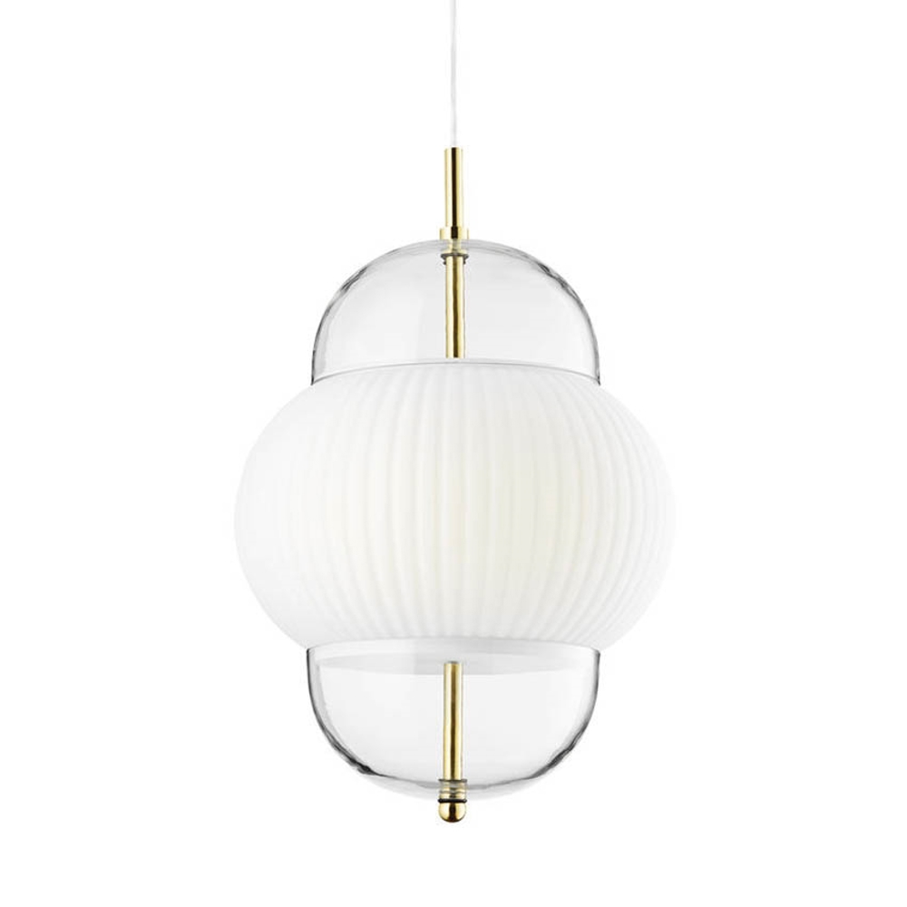 Shahin er en utrolig elegant pendel med flotte detaljer i messing, der består af to glasskærme og et smukt hvidt opalglas i midten.