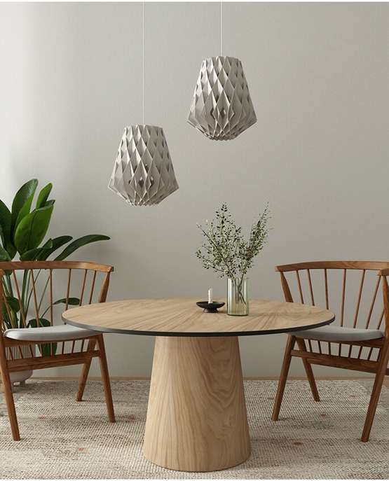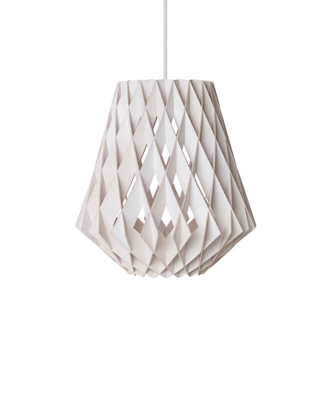Pendlen har med sin store facon en fylde i rummet og passer både ind i private eller offentlige miljøer. Pendlen består af bæredygtig certificerede birkekrydsfiner, der er håndlavede. Birkelamellerne skaber en varme, når lyset skinner igennem, og er samlet uden skruer eller lim. Derudover har pendlen et stilfuldt og geometrisk design, der skaber blikfang til ethvert rum.