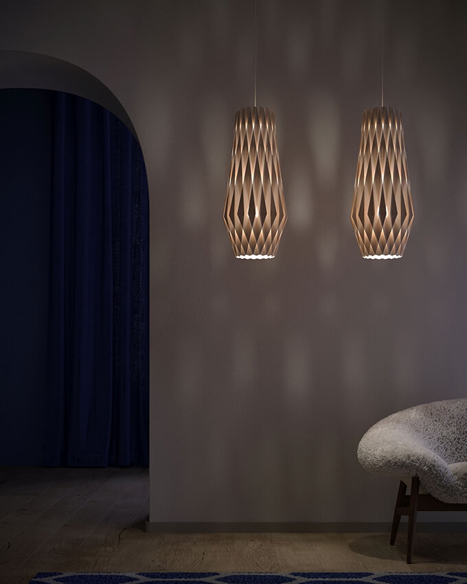 Pendlen har med sin store facon en fylde i rummet og passer både ind i private eller offentlige miljøer. Pendlen består af bæredygtig certificerede birkekrydsfiner, der er håndlavede. Birkelamellerne skaber en varme, når lyset skinner igennem, og er samlet uden skruer eller lim. Derudover har pendlen et stilfuldt og geometrisk design, der skaber blikfang til ethvert rum.