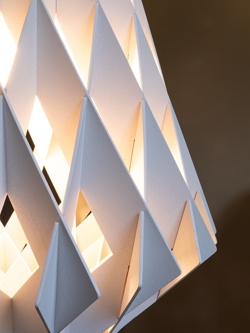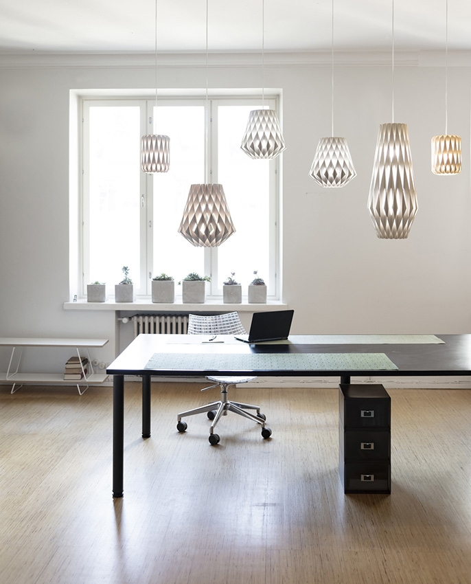 Pendlen har med sin store facon en fylde i rummet og passer både ind i private eller offentlige miljøer. Pendlen består af bæredygtig certificerede birkekrydsfiner, der er håndlavede. Birkelamellerne skaber en varme, når lyset skinner igennem, og er samlet uden skruer eller lim. Derudover har pendlen et stilfuldt og geometrisk design, der skaber blikfang til ethvert rum.