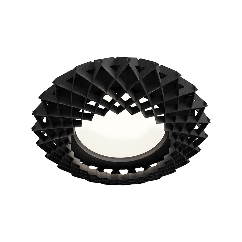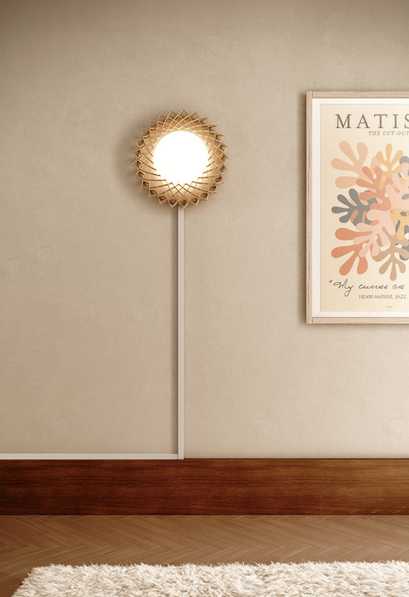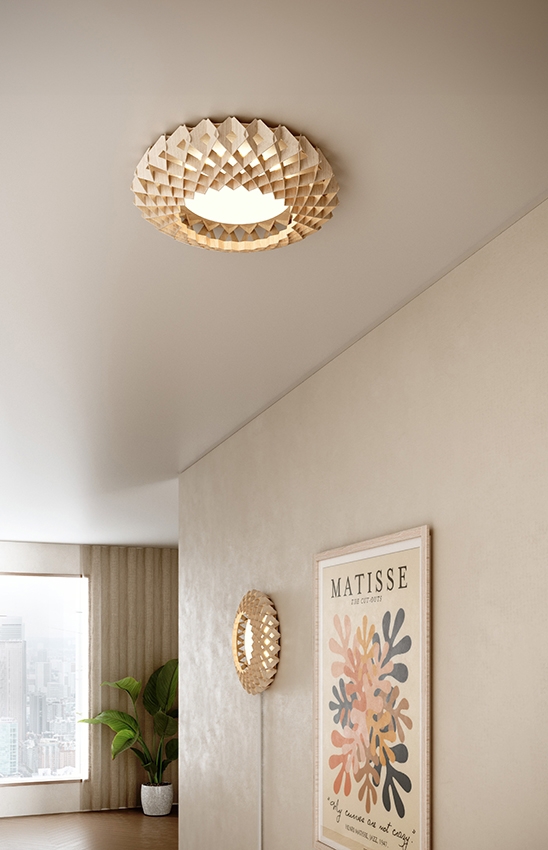 Denne flotte lampe kan både bruges som væglampe og loftlampe i entreen, stuen eller soveværelset. Lampen pynter meget og har en flot udformning. Den består af bæredygtig certificerede birkekrydsfiner, der er håndlavede. Birkelamellerne skaber en varme, når lyset skinner igennem, og er samlet uden skruer eller lim. Derudover har lampen et stilfuldt og geometrisk design, der skaber blikfang til ethvert rum
