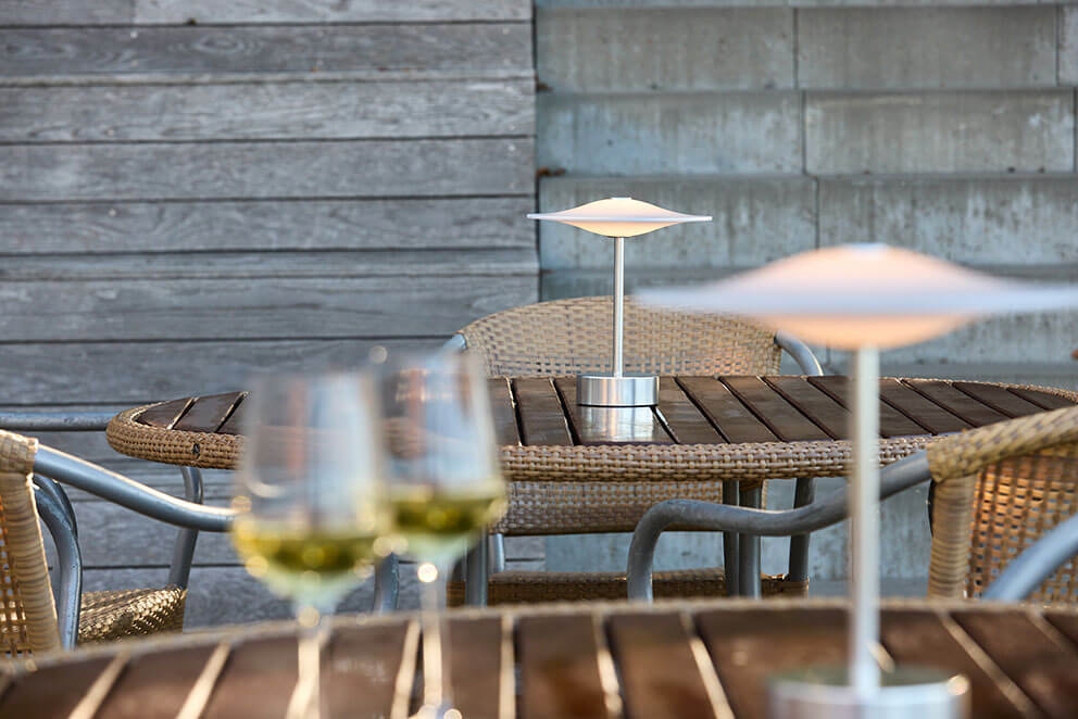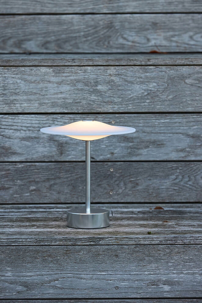Den transportable bordlampe Sinus Portable kan benyttes både indendørs og udendørs og er perfekt til middagsbordet, hyggelige stunder i stuen eller sommeraftener på terrassen. Den er dæmpbar i tre trin via en touch-funktion på toppen og leverer et blødt og behageligt blændfrit lys. På fuld styrke lyser batterilampen op til 10 timer og med lysstyrken på 40% op til 24 timer og på 10% i op til 86 timer.