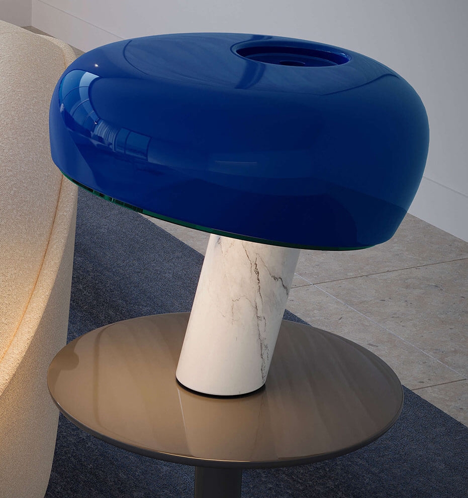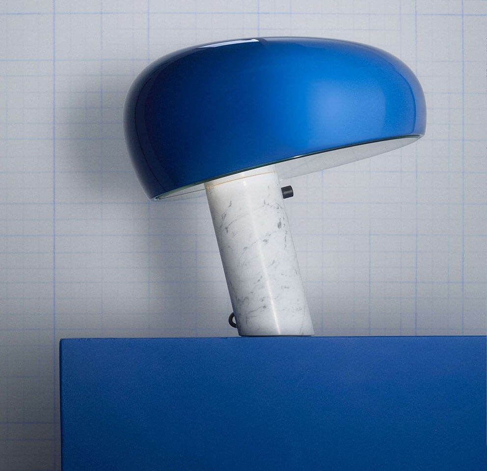 Lampens emaljerede metalskærm hviler elegant på en solid fod i poleret marmor, hvilket giver et eksklusivt og sofistikeret udtryk. Kombinationen af form, materiale og proportioner gør Snoopy til et iøjnefaldende designobjekt, der passer ind i både moderne og klassiske indretninger.
