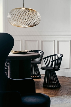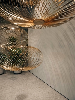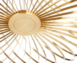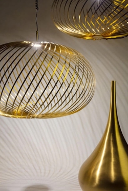 Spring pendlen er sammensat af flere bøjelige bånd i rustfrit stål med messingfinish, der kan justeres som en fjeder til en række forskellige silhuetter fra en helt flad form til en fyldig græskarform. Pendlen har et flot samspil mellem lys og skygge og vil passe godt ind i mange indretninger. Den kan eksempelvis placeres over spisebordet.