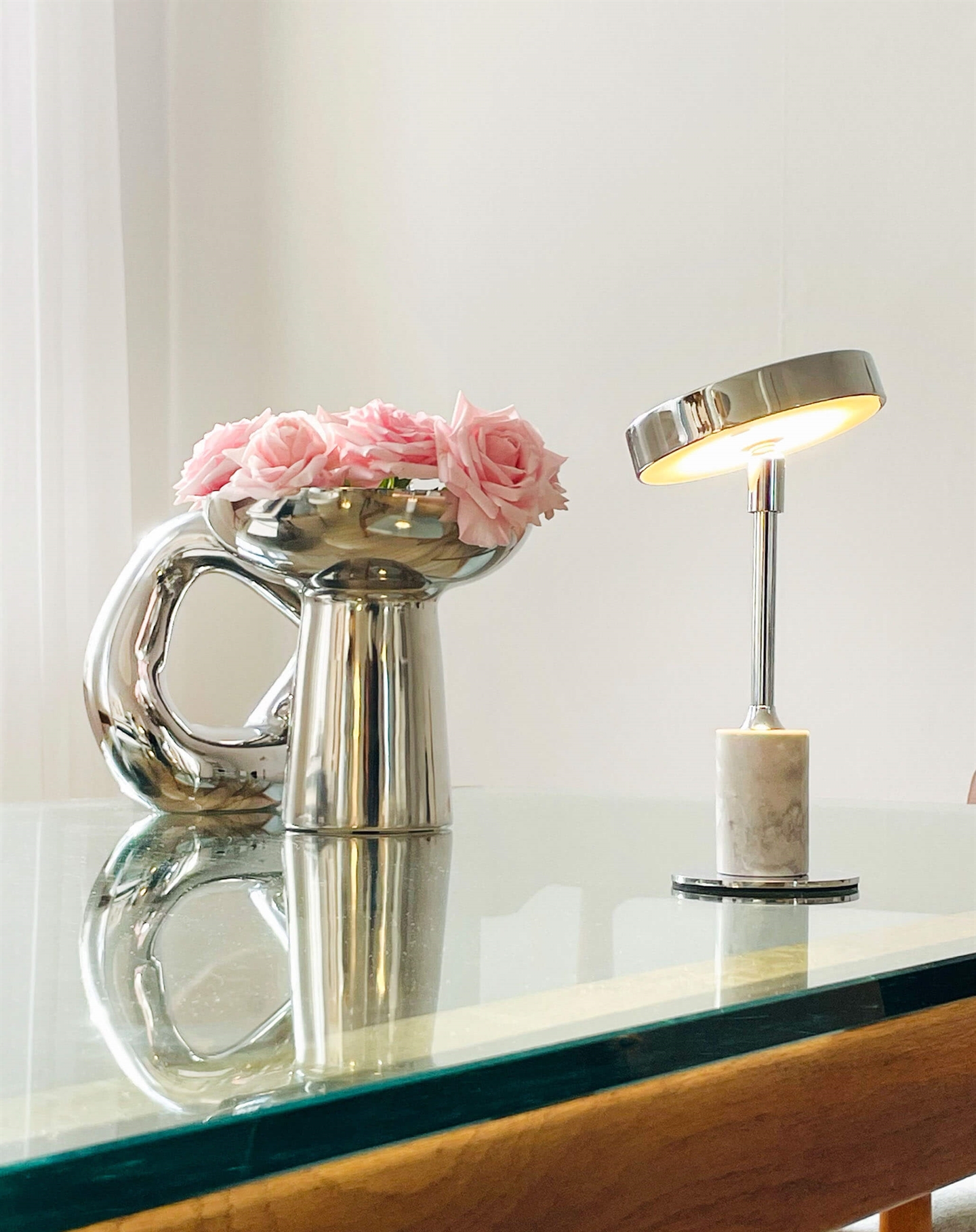 Den genopladelig batterilampe Starlight Mini LED har et slankt design i krom kombineret med en solid marmorbase, som giver bordlampen et elegant og eksklusivt udtryk. Den integrerede LED-lyskilde er dæmpbar i tre trin på 100%, 60% og 20%, så lysstyrken kan tilpasses situationen. Samtidig kan skærmen vippes, hvilket sikrer fleksibilitet i justeringen af lysets retning, uanset om du vil arbejde ved skrivebordet eller skaber hyggelig belysning i stuen.