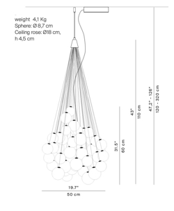 Stochastic findes med enten 48 eller 72 glaskugler, hver hængende i varierende højder, hvilket resulterer i en fantasifuld og dekorativ klynge.