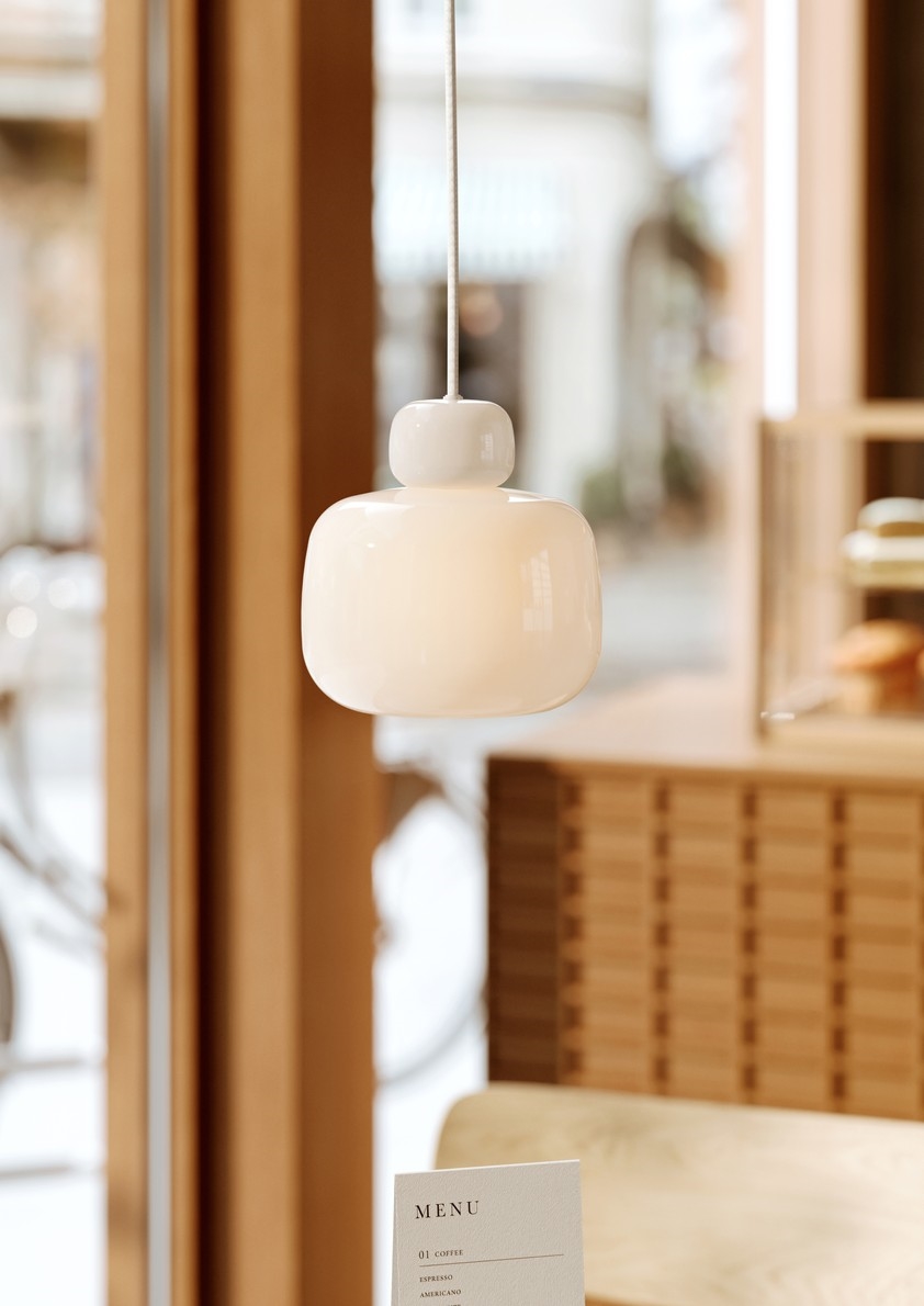 Den mælkehvide Stone-pendel i triplex opalglas er introduceret i 2026 og fås i to størrelser med matchende hvid stofledning og baldakin