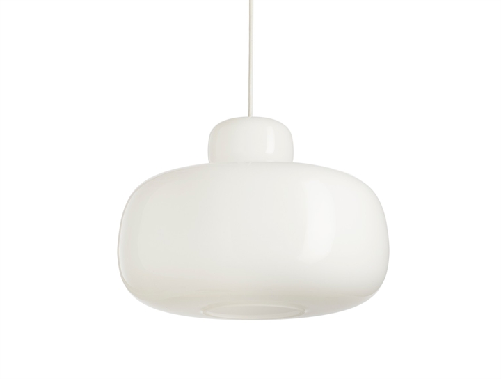 Denne mælkehvide Stone-pendel i triplex opalglas er introduceret i 2026 og har et elegant aflangt silhuet, der er en ny tilføjelse til Stones-serien. Der er også introduceret en lille pendel i triplex opalglas med Stones velkendte form. Begge leveres
