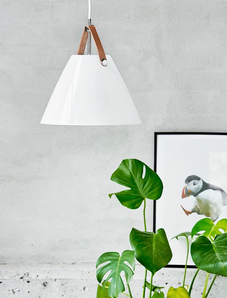 Pendlen Strap 27 kombinerer opalglas og læder i en moderne nordisk stil. Strap-serien har fået navn efter de iøjnefaldende remme, der tilføjer varme og noget råt til lampen. Designet balancerer mellem et klassisk og et industrielt udtryk.