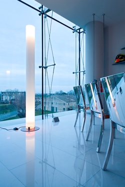 Stylos er en elegant og stor gulvlampe, der skiller sig ud med formen og det orange skær, der lyser op fra bunden
