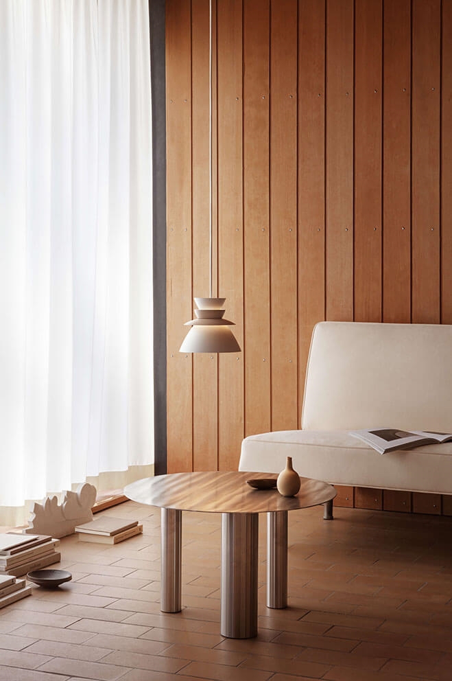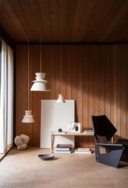 Den ikoniske pendel Sundowner designet af Jørn Utzon i 1948 skaber behagelig og stemningsfyldt belysning, når solen går ned. Når pendlen er tændt leder den horisontale midterlinje tankerne hen på solens sidste stråler.