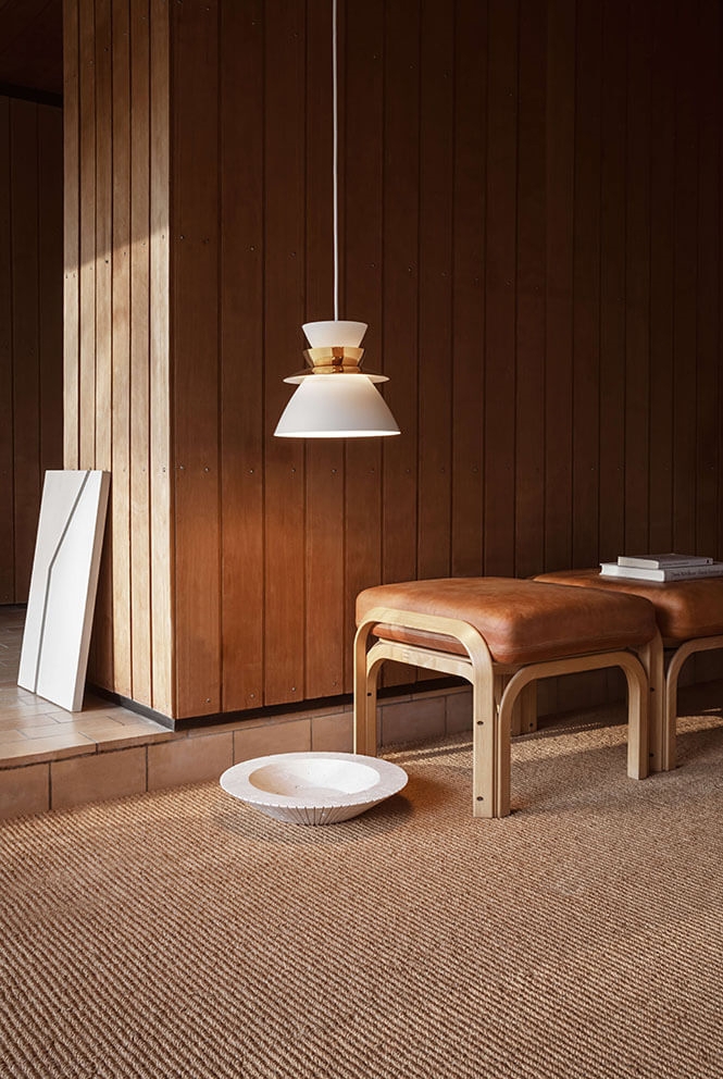 Den ikoniske pendel Sundowner designet af Jørn Utzon i 1948 skaber behagelig og stemningsfyldt belysning, når solen går ned. Når pendlen er tændt leder den horisontale midterlinje tankerne hen på solens sidste stråler.
