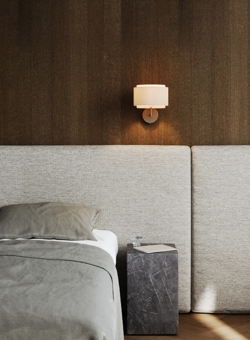 Væglampen Takai består af en arm i bruneret messing og en stofskærm. Sammenspillet mellem den brunerede messing og skærmen i hør skaber et blødt og varmt designudtryk.