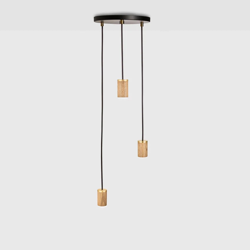 Tale Triple pendel fås med en hvid eller sort loftsbaldakin, med tilhørende greb i enten sort, messing, grafit og oak.