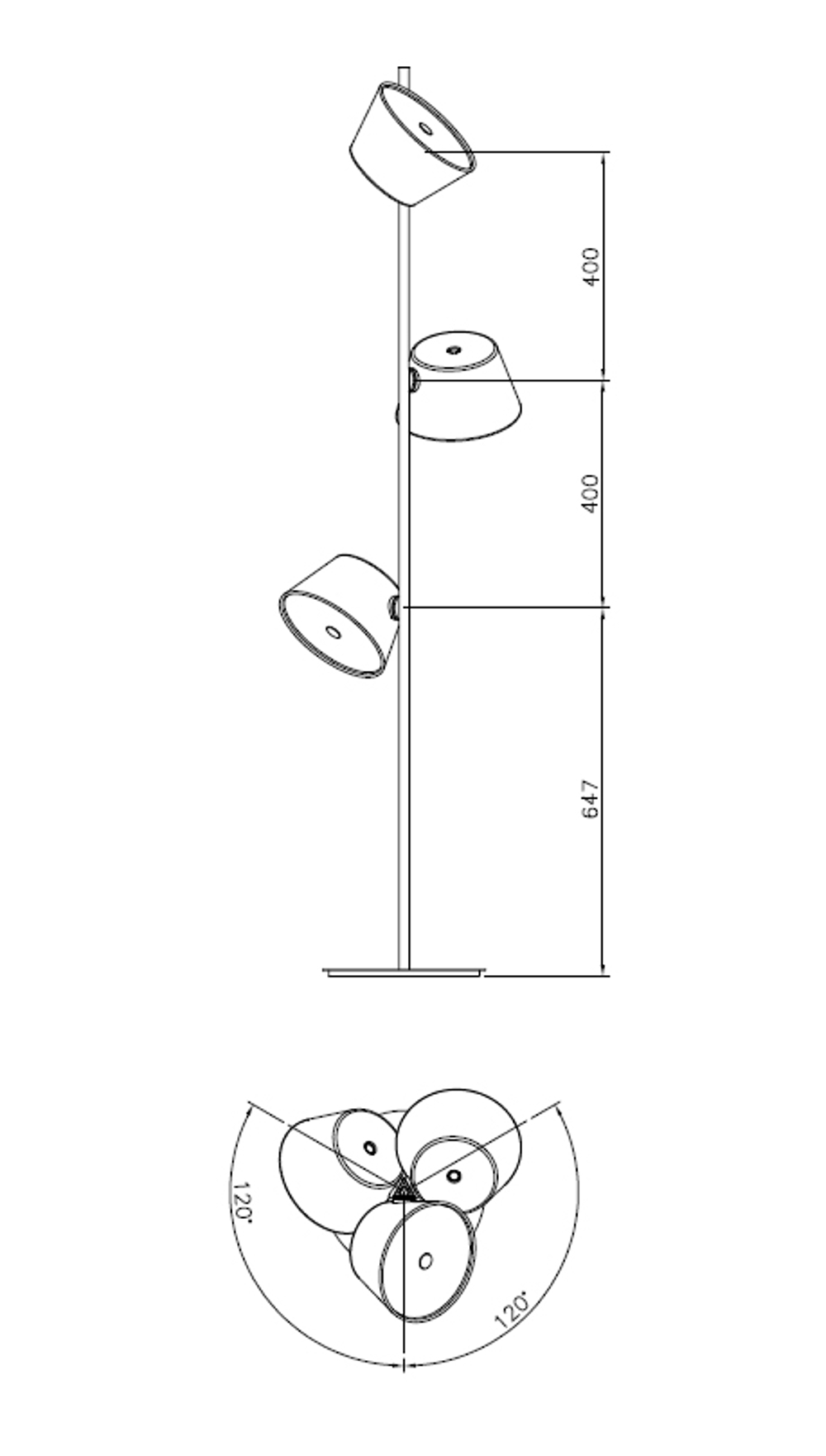 Gulvlampen har et sort stel, samt tre sorte skærme langs stellet. Skærmene kan roteres 360°, hvilket gør det muligt at tilpasse lyset til alle behov.