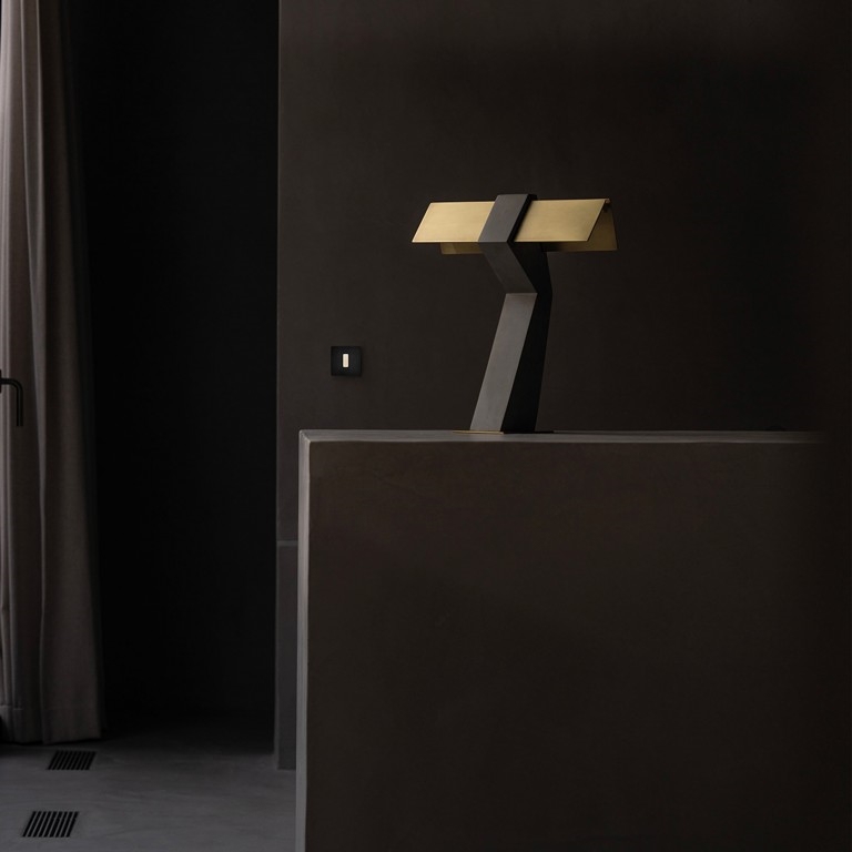 Bordlampen består af en base af beton og en trekantformet skærm i messing. Skærmens udformning giver et nedadrettet lys, som virker blændfrit og behageligt i rummet.