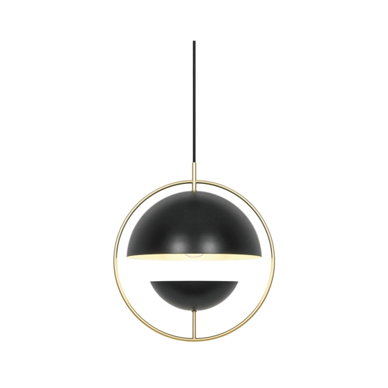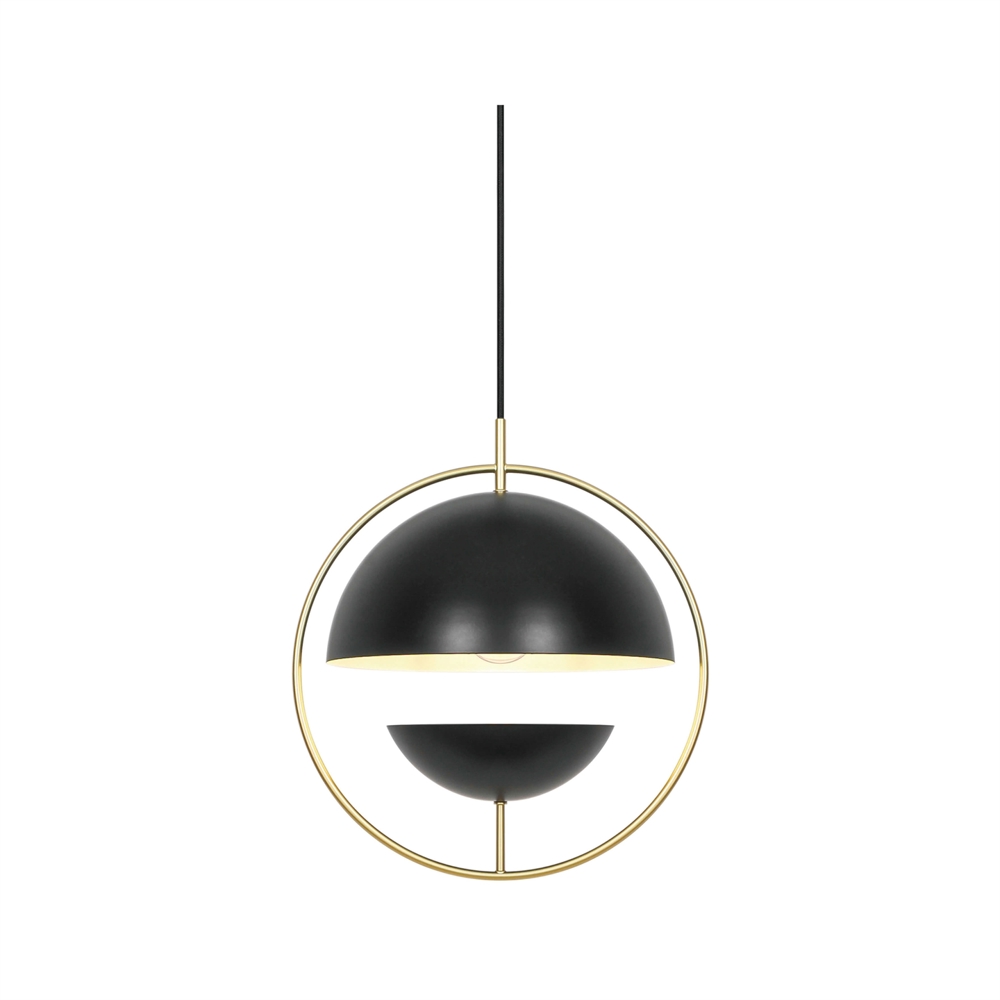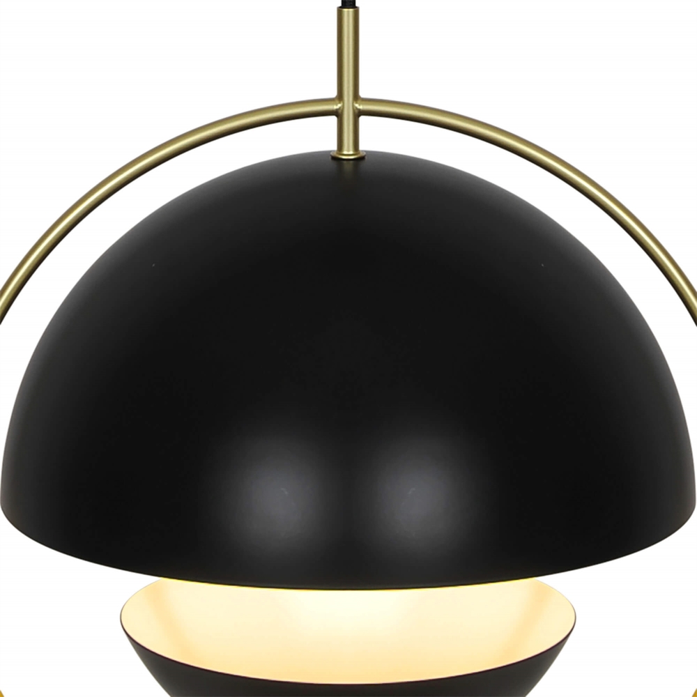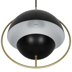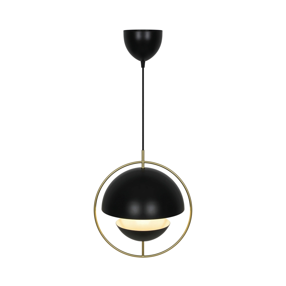 Tavia er en dekorativ pendel med et minimalistisk design og glamourøst udtryk. De to halvrunde matte skærme i sort er omkranset af en elegant ring i skinnende messing og sikrer et behageligt lys.