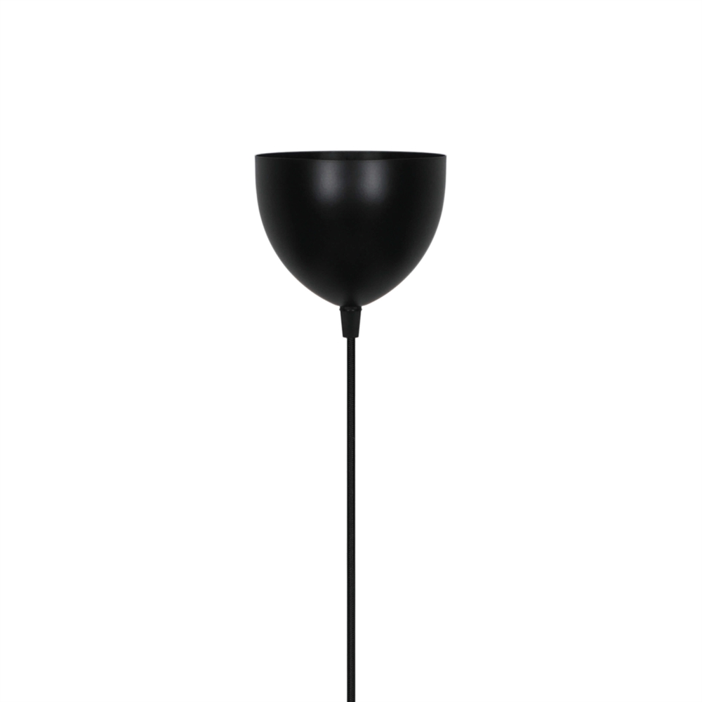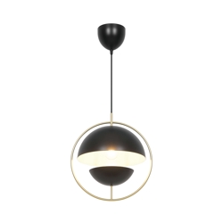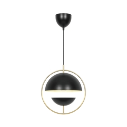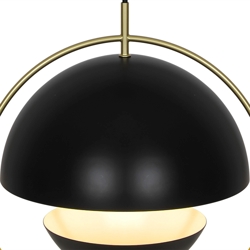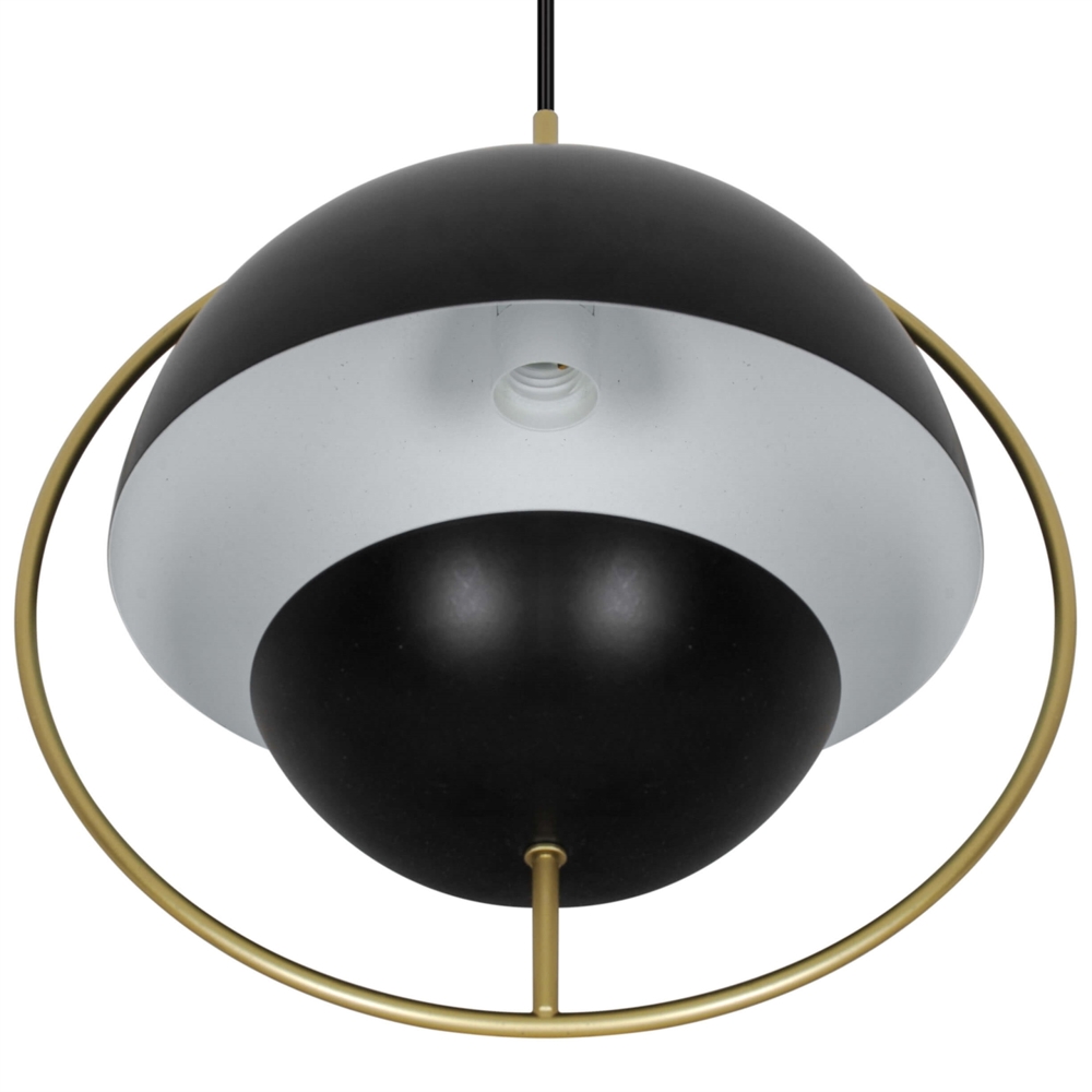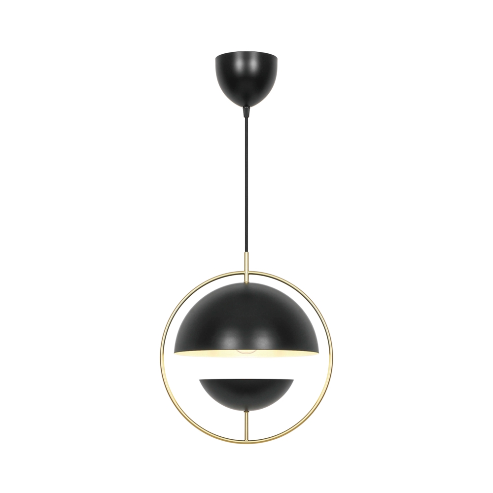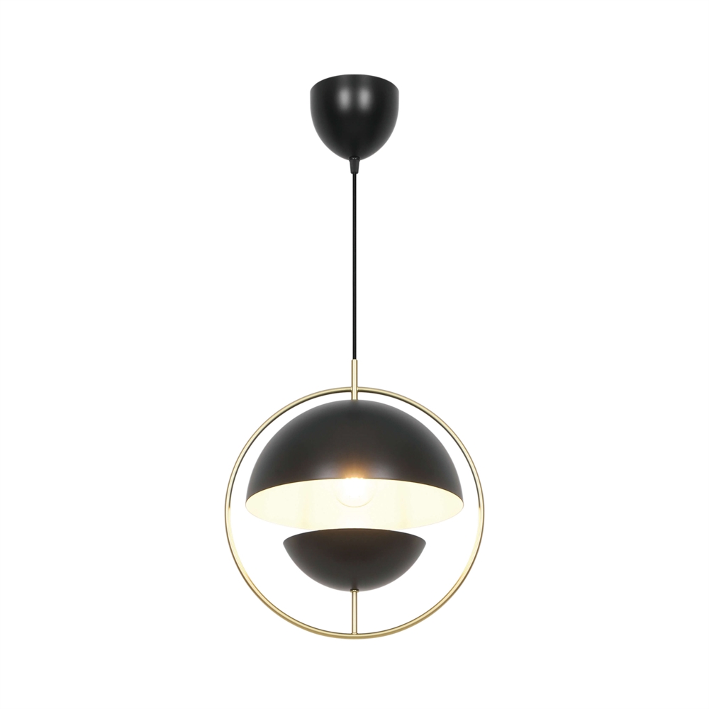 Tavia er en dekorativ pendel med et minimalistisk design og glamourøst udtryk. De to halvrunde matte skærme i sort er omkranset af en elegant ring i skinnende messing og sikrer et behageligt lys.