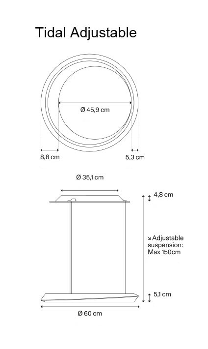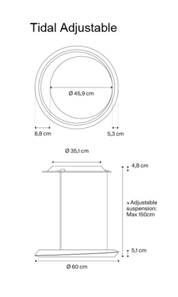 Tidal har et behageligt lys, der sendes både opad og nedad fra pendlens slanke design. Tidal Adjustable har efter montering en justerbar højde fra baldakinen på max 1,5 meter. Pendlen fås i flere farver med sort eller hvid baldakin og i en ikke-justerbar variant med en max højde fra baldakinen på 4 meter. Tidal findes også som loftlampe.