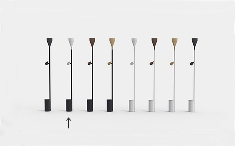 Timber Floor findes udover i sort også i hvid med spot og uplight i fire forskellige varianter: eg, valnød, hvidbejdset ask eller sortbejdset ask. Her er Timber Floor vist med spot og uplight i valnød.