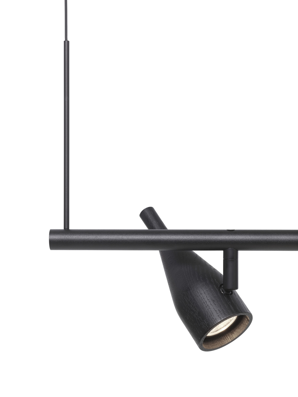 Timber Line 3 har tre bevægelige spots. Pendlen kan bruges over et spisebord eller skrivebord eller måske til at lyse et skab eller en væg op.