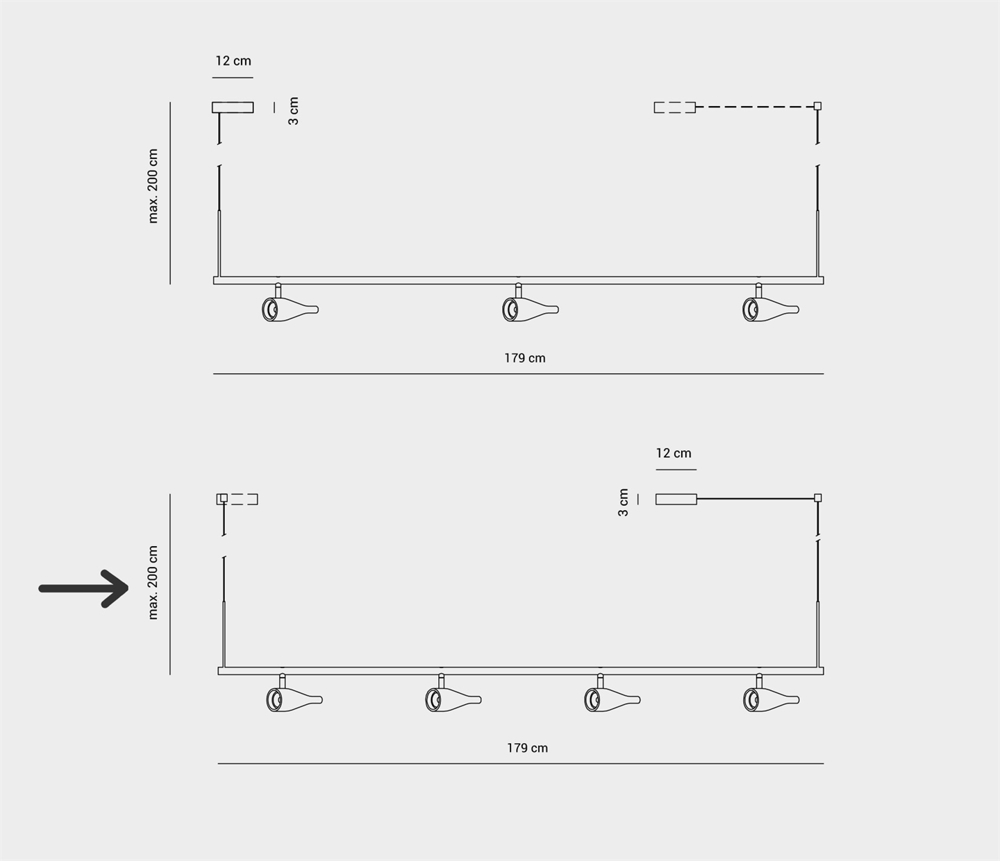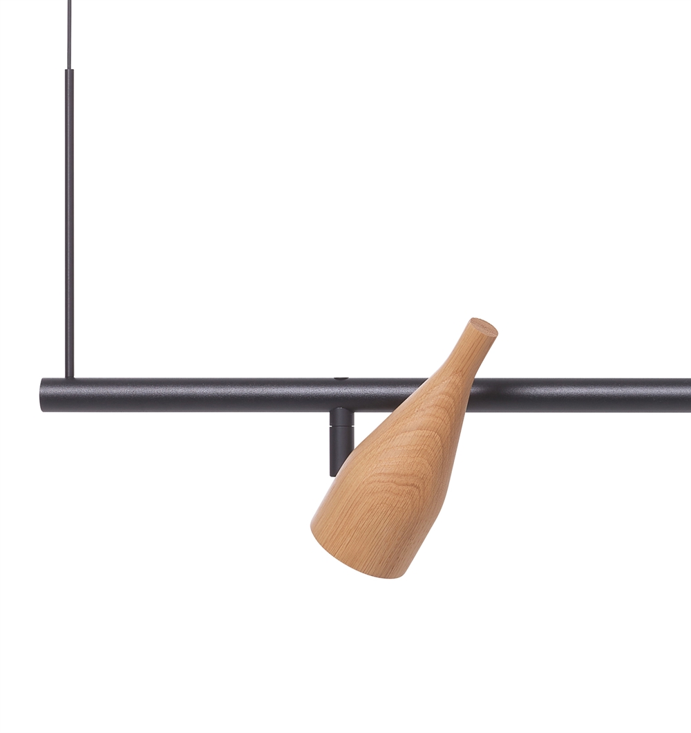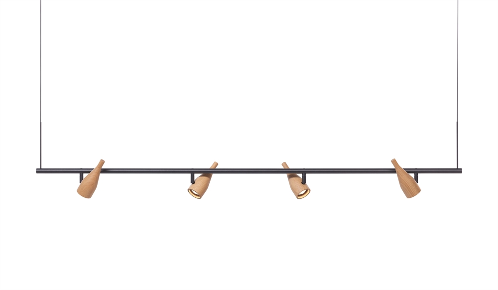 Timber Line 4 har fire bevægelige spots. Pendlen kan bruges over et spisebord eller skrivebord eller måske til at lyse et skab eller en væg op.