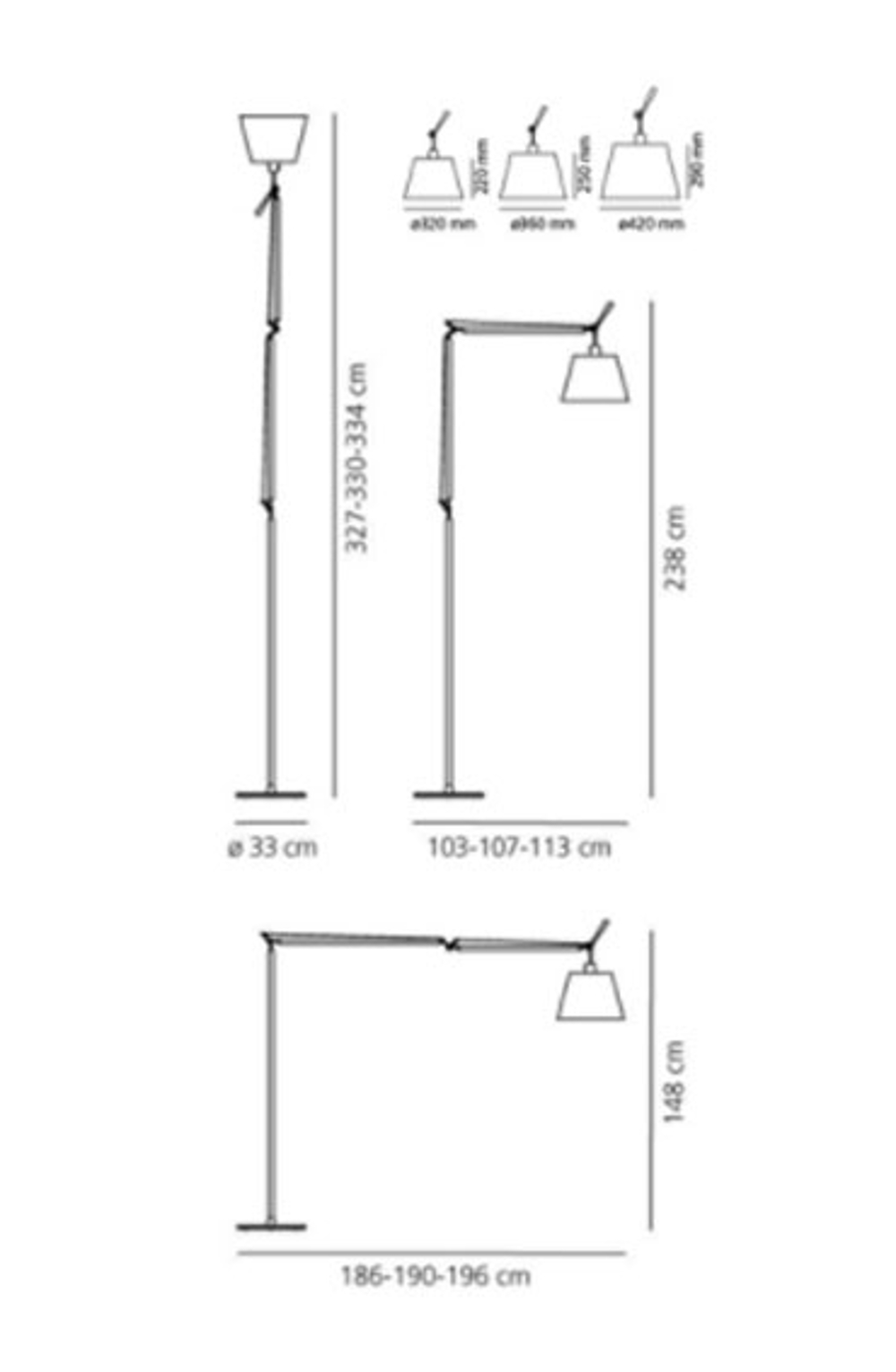 Megasize standerlampe i poleret aluminium med grå silkesatin- eller pergamentskærm fra Tolomeo.