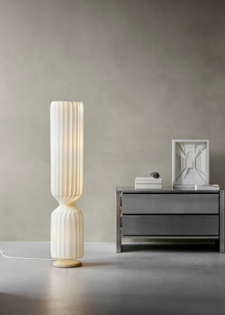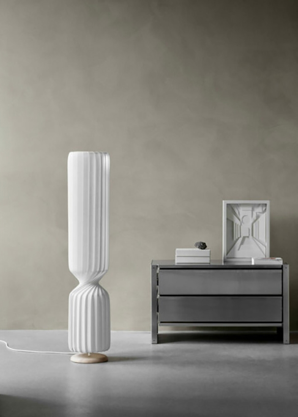 Lampeskærmen på pendlen er samlet med et stykke birketræ i toppen, ligesom gulvlampen også står på en fod af birketræ, som giver seriens skarpe skulpturelle udtryk et varmt og naturligt præg.