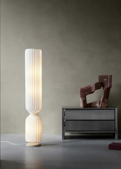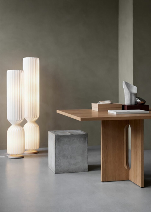 Lampeskærmen på pendlen er samlet med et stykke birketræ i toppen, ligesom gulvlampen også står på en fod af birketræ, som giver seriens skarpe skulpturelle udtryk et varmt og naturligt præg.