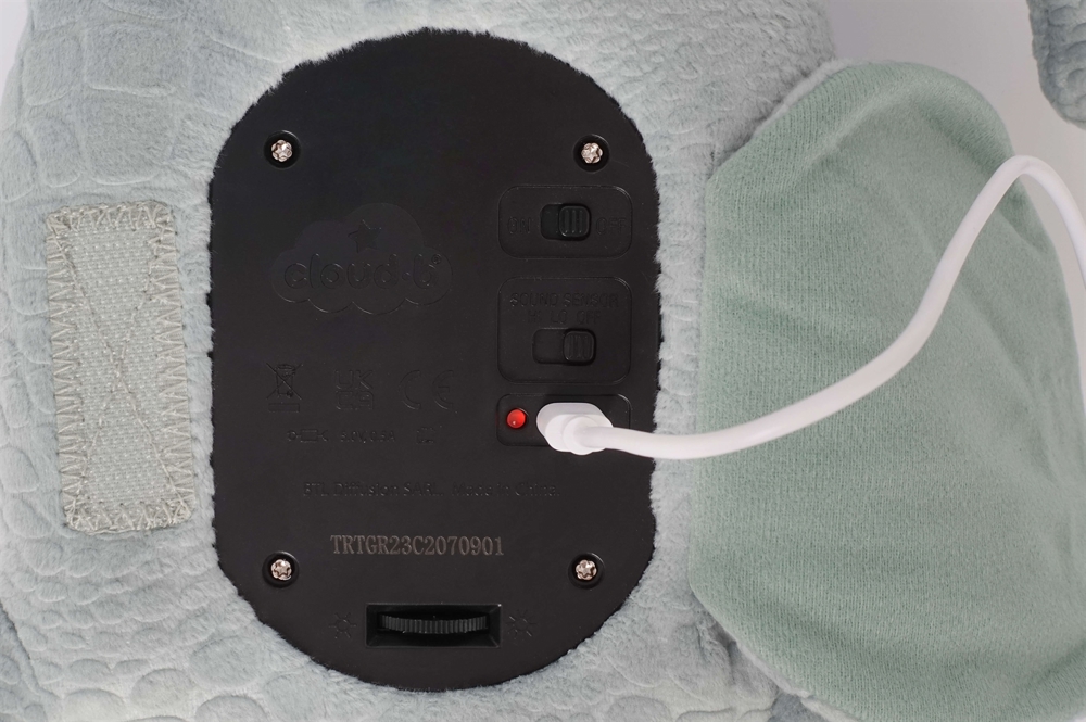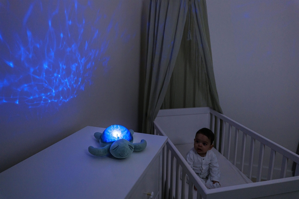 to beroligende melodi eller lyden af hvalsang eller havbølger, der virker afslappende. Det er muligt at justere lysstyrken i seks niveauer for at skabe det perfekte søvnmiljø. Yderligere har skildpadden en 23-minutters timer, som sikrer fuldstændig mørke og stilhed, når barnet er faldet i søvn. En grædesensoren genstarter skildpadden ved barnets første gråd.